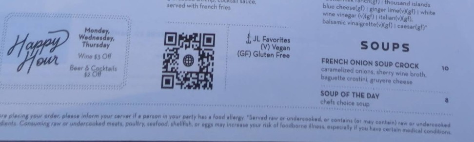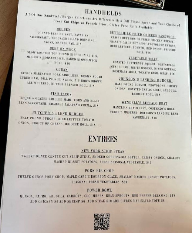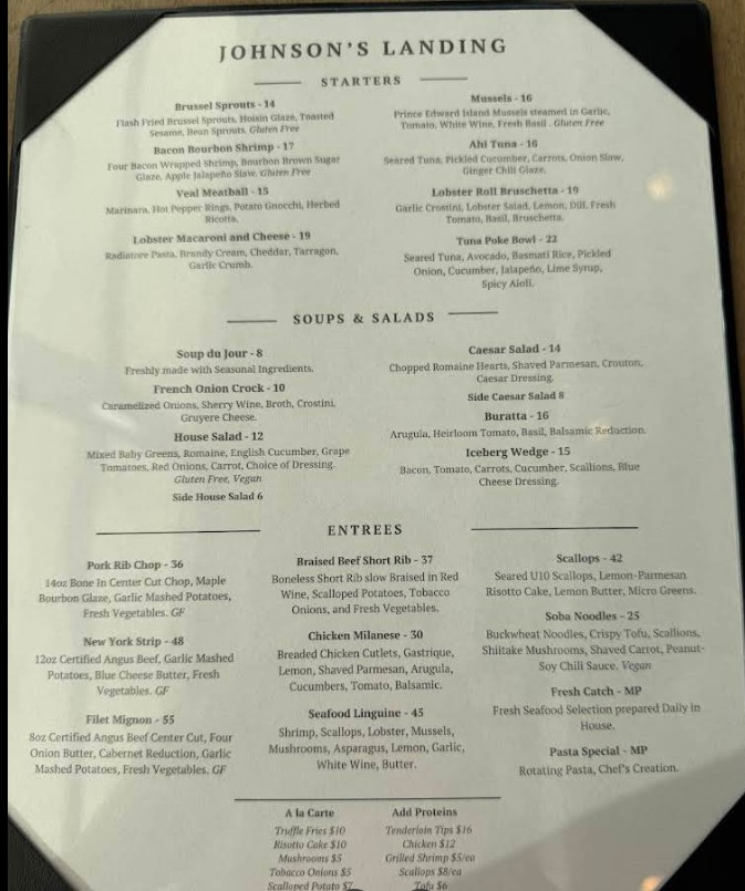 We went to Johnson's Landing for lunch. We were pleasantly greeted when we arrived. Any questions we had about the restaurant were answered. We were seated at a table next to the window. We had plenty of room. We ordered a brick oven pizza. All pizzas are $20. It was delicious. It came with 8 slices. More than enough for two people. Our server was efficient and friendly. We never had to asked for refills for my granddaughter's Shirley Temple. You can make reservations for dinner where you can be seated on the second level. That is definitely something I would like to do in the future. From the second level, you can see the lake. I highly recommend Johnson's Landing. We really enjoyed the atmosphere, friendliness and prompt service.
